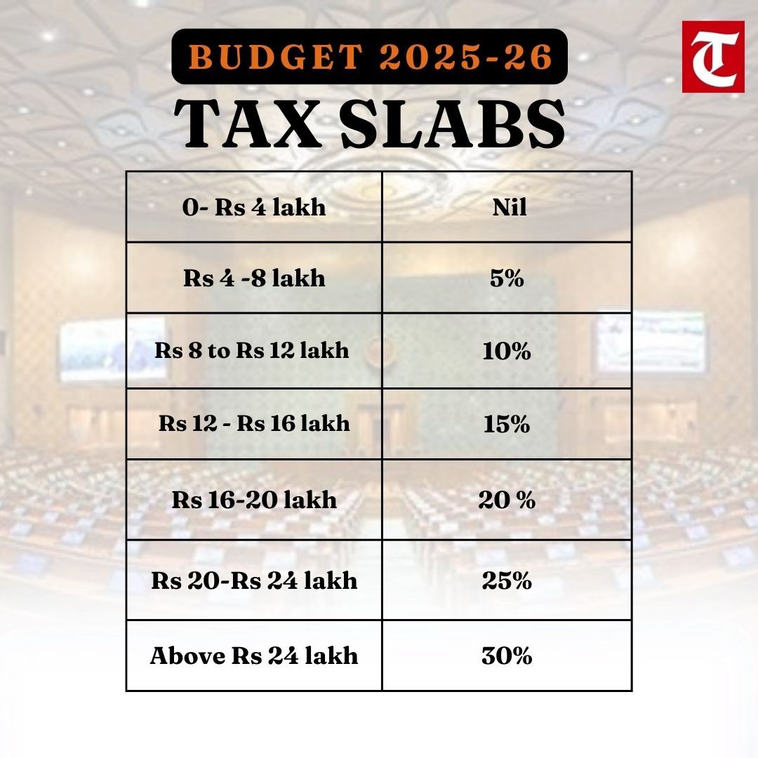 ਵਿੱਤ ਮੰਤਰੀ ਨੇ ਇਸ ਦੇ ਨਾਲ ਟੈਕਸ ਸਲੈਬ ਵਿਚ ਬਦਲਾਅ ਦੀ ਤਜਵੀਜ਼ ਦਿੱਤੀ ਹੈ, ਜਿਸ ਤਹਿਤ ਚਾਰ ਲੱਖ ਰੁਪਏ ਦੀ ਸਾਲਾਨਾ ਆਮਦਨ ’ਤੇ ਕੋਈ ਟੈਕਸ ਨਹੀਂ ਲੱਗੇਗਾ। ਚਾਰ ਤੋਂ ਅੱਠ ਲੱਖ ਰੁਪਏ ਤੱਕ 5 ਫੀਸਦ, 8 ਤੋਂ 12 ਲੱਖ ਤੱਕ 10 ਫੀਸਦ, 12 ਲੱਖ ਤੋੋਂ 16 ਲੱਖ ਰੁਪਏ ਤੱਕ 15 ਫੀਸਦ, 16 ਲੱਖ ਤੋਂ 20 ਲੱਖ ਰੁਪਏ ਤੱਕ 20 ਫੀਸਦ, 20 ਲੱਖ ਤੋਂ 24 ਲੱਖ ਤੱਕ 25 ਫੀਸਦੀ ਅਤੇ 24 ਲੱਖ ਤੋਂ ਉੱਤੇ ਸਾਲਾਨਾ 30 ਫੀਸਦ ਟੈਕਸ ਲੱਗੇਗਾ। ਸਿੱਧੇ ਟੈਕਸ ਵਿਚ ਛੋਟ ਨਾਲ ਸਰਕਾਰੀ ਖ਼ਜ਼ਾਨੇ ’ਤੇ ਇਕ ਲੱਖ ਕਰੋੜ ਰੁਪਏ ਦਾ ਬੋਝ ਪਏਗਾ। -ਪੀਟੀਆਈ