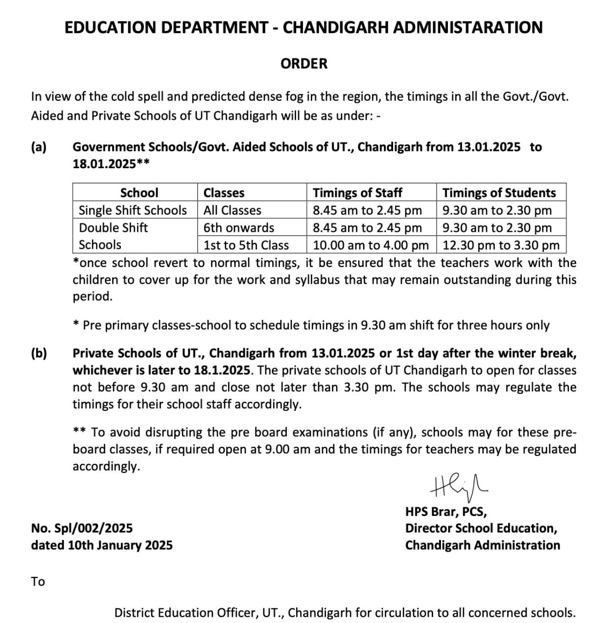 ਠੰਢ ਤੇ ਸੰਘਣੀ ਧੁੰਦ ਕਰਕੇ ਚੰਡੀਗੜ੍ਹ ਦੇ ਸਾਰੇ ਸਰਕਾਰੀ/ਸਰਕਾਰੀ ਸਹਾਇਤਾ ਪ੍ਰਾਪਤ ਤੇ ਨਿੱਜੀ ਸਕੂਲਾਂ ਦਾ ਸਮਾਂ ਤਬਦੀਲ ਕੀਤਾ ਗਿਆ ਹੈ। ਡਾਇਰੈਕਟਰ ਸਕੂਲ ਸਿੱਖਿਆ ਨੇ ਪ੍ਰੈੱਸ ਰਿਲੀਜ਼ ’ਚ ਸਕੂਲਾਂ ਦਾ ਸਮਾਂ ਤਬਦੀਲ ਕਰਨ ਬਾਰੇ ਸੂਚਿਤ ਕੀਤਾ ਹੈ।