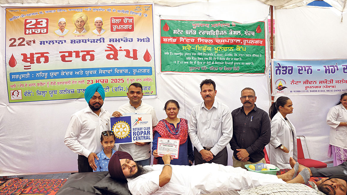 ਰੂਪਨਗਰ (ਜਗਮੋਹਨ ਸਿੰਘ): ਜ਼ਿਲ੍ਹਾ ਯੂਥ ਕਲੱਬਜ਼ ਤਾਲਮੇਲ ਕਮੇਟੀ ਰੂਪਨਗਰ ਵੱਲੋਂ ਸਰਦਾਰ ਭਗਤ ਸਿੰਘ, ਰਾਜਗੁਰੂ , ਸੁਖਦੇਵ ਦੇ ਸ਼ਹੀਦੀ ਦਿਹਾੜੇ ਨੂੰ ਸਮਰਪਿਤ ਖੂਨਦਾਨ ਕੈਂਪ ਲਾਇਆ ਗਿਆ। ਇਸ ਕੈਂਪ ਦੌਰਾਨ 95 ਯੂਨਿਟ ਖੂਨ ਇਕੱਤਰ ਕੀਤਾ ਗਿਆ। ਇਸ ਮੌਕੇ ਰੋਟਰੀ ਕਲੱਬ ਰੋਪੜ ਸੈਂਟਰਲ ਦੇ ਸਾਬਕਾ ਪ੍ਰਧਾਨ ਰੋਟੇਰੀਅਨ ਅਜਮੇਰ ਸਿੰਘ ਲੋਦੀ ਮਾਜਰਾ ਨੇ 27ਵੀਂ ਵਾਰ ਖੂਨ ਦਾਨ ਕੀਤਾ।