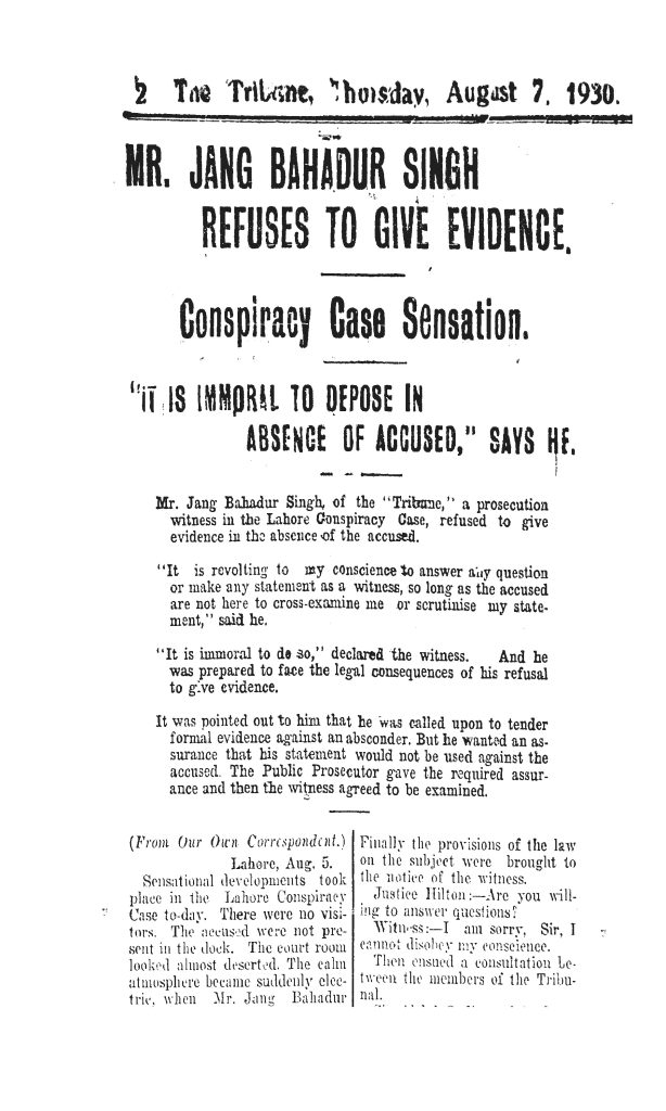 ਸਰਕਾਰ ਬਨਾਮ ਸੁਖਦੇਵ ਵਗੈਰਾ ਮੁਲਜ਼ਮਾਨ’ ਮੁਕੱਦਮਾ, ਜਿਸ ਨੂੰ ਆਮ ਤੌਰ ਉੱਤੇ ਲਾਹੌਰ ਸਾਜ਼ਿਸ਼ ਮੁਕੱਦਮੇ ਦੇ ਨਾਂ ਨਾਲ ਜਾਣਿਆ ਜਾਂਦਾ ਹੈ, ਸਰਕਾਰ ਨੇ ਮਈ 1930 ਵਿੱਚ ਸਪੈਸ਼ਲ ਮੈਜਿਸਟ੍ਰੇਟ ਤੋਂ ਵਾਪਸ ਲੈ ਕੇ ਵਿਸ਼ੇਸ਼ ਟ੍ਰਿਬਿਊਨਲ ਦੇ ਹਵਾਲੇ ਕਰ ਦਿੱਤਾ। ਟ੍ਰਿਬਿਊਨਲ ਨੇ ਲਗਭਗ ਦੋ ਮਹੀਨੇ ਦੀ ਸੁਣਵਾਈ ਉਪਰੰਤ 10 ਜੁਲਾਈ ਨੂੰ ਮੁਲਜ਼ਮਾਂ ਖਿਲਾਫ਼ ਦਸ ਦੋਸ਼ ਆਇਦ ਕੀਤੇ ਜਿਨ੍ਹਾਂ ਵਿੱਚ ਇੱਕ ‘ਸ਼ਹਿਨਸ਼ਾਹੇ-ਹਿੰਦ ਕੋ ਬ੍ਰਿਟਿਸ਼ ਇੰਡੀਆ ਯਾ ਉਸ ਕੇ ਕਿਸੀ ਹਿੱਸਾ ਕੀ ਫਰਮਾ ਰਵਾਈ ਸੇ ਮਹਿਰੂਮ ਕਰਨੇ ਕੀ ਸਾਜ਼ਿਸ਼’ ਰਚਣ ਦਾ ਸੀ। ਜਿਨ੍ਹਾਂ 21 ਮੁਲਜ਼ਮਾਂ ਖ਼ਿਲਾਫ਼ ਦੋਸ਼ ਲਾਏ ਗਏ ਸਨ, ਉਨ੍ਹਾਂ ਵਿੱਚੋਂ 6 ਭਗੌੜੇ ਸਨ ਅਤੇ ਇਨ੍ਹਾਂ ਵਿੱਚੋਂ ਹੀ ਇੱਕ ਸੀ ਭਗਵਤੀ ਚਰਨ। ਭਗਵਤੀ ਚਰਨ ਦੀ ਤ੍ਰਾਸਦੀ ਇਹ ਸੀ ਕਿ ਉਹ ਨੌਜਵਾਨ ਭਾਰਤ ਸਭਾ ਅਤੇ ਹਿੰਦੋਸਤਾਨ ਰਿਪਬਲਿਕਨ ਐਸੋਸੀਏਸ਼ਨ ਦੇ ਮਿਥੇ ਟੀਚਿਆਂ ਦੀ ਪ੍ਰਾਪਤੀ ਲਈ ਯਤਨ ਕਰਨ ਵਿੱਚ ਜਿੰਨਾ ਸੁਹਿਰਦ ਸੀ, ਉਸ ਦੇ ਬਹੁਤੇ ਸਾਥੀ ਉਸ ਉੱਤੇ ਓਨੀ ਹੀ ਬੇਭਰੋਸਗੀ ਰੱਖਦੇ ਸਨ। ਅਜਿਹੀ ਸਥਿਤੀ ਪੈਦਾ ਕਰਨ ਦਾ ਜ਼ਿੰਮੇਵਾਰ ਨੈਸ਼ਨਲ ਕਾਲਜ ਦਾ ਪ੍ਰੋਫੈਸਰ ਜੈ ਚੰਦਰ ਸੀ। ਭਗਵਤੀ ਚਰਨ ਉਮਰ, ਸਿੱਖਿਆ ਅਤੇ ਤਜਰਬੇ ਪੱਖੋਂ ਸਾਰੇ ਸਹਿਕਰਮੀਆਂ ਵਿੱਚੋਂ ਉੱਪਰ ਅਤੇ ਗ਼ਲਤ ਨੂੰ ਗ਼ਲਤ ਕਹਿਣ ਦੀ ਜੁਰੱਅਤ ਰੱਖਦਾ ਸੀ। ਉਸ ਦੀ ਇਸ ਕਾਬਲੀਅਤ ਕਾਰਨ ਹੀ ਪ੍ਰੋ. ਜੈ ਚੰਦਰ ਉਸ ਨਾਲ ਈਰਖਾ ਕਰਦਾ ਸੀ। ਉਸ ਨੇ ਬੜੀ ਹੁਸ਼ਿਆਰੀ ਨਾਲ ਭਗਵਤੀ ਚਰਨ ਦੇ ਪੁਲੀਸ ਨਾਲ ਰਲਿਆ ਹੋਣ ਦੀ ‘ਸ਼ੁਰਲੀ’ ਛੱਡੀ ਜਿਸ ਨੇ ਸਾਥੀਆਂ ਦੇ ਮਨਾਂ ਵਿੱਚ ਭਗਵਤੀ ਚਰਨ ਬਾਰੇ ਸ਼ੰਕੇ ਪੈਦਾ ਕਰ ਦਿੱਤੇ। ਫਲਸਰੂਪ ਉਸ ਨੂੰ ਜਥੇਬੰਦੀ ਵੱਲੋਂ ਵਿਉਂਤੇ ਕਾਰਜਾਂ ਬਾਰੇ ਜਾਣਕਾਰੀ ਨਹੀਂ ਸੀ ਦਿੱਤੀ ਜਾਂਦੀ। ਇਸ ਸਭ ਕੁਝ ਨੂੰ ਸਮਝਦਾ ਹੋਇਆ ਵੀ ਭਗਵਤੀ ਚਰਨ ਸਿਰੜ ਅਤੇ ਦ੍ਰਿੜਤਾ ਨਾਲ ਜਥੇਬੰਦੀ ਦੇ ਅੰਗ ਸੰਗ ਖੜ੍ਹਾ ਸੀ ਅਤੇ ਜਥੇਬੰਦੀ ਵੱਲੋਂ ਸੌਂਪੇ ਜਾਣ ਵਾਲੇ ਹਰ ਕੰਮ ਨੂੰ ਬਿਨਾਂ ਮੱਥੇ ਵੱਟ ਪਾਏ ਨਿਭਾਉਂਦਾ ਸੀ। ਸਿਰਫ਼ ਭਗਤ ਸਿੰਘ ਸੀ ਜੋ ਜੈ ਚੰਦਰ ਦੇ ਵਿਹਾਰ ਦੇ ਪਿਛੋਕੜ ਨੂੰ ਸਮਝਦਾ ਹੋਣ ਕਾਰਨ ਭਗਵਤੀ ਚਰਨ ਨਾਲ ਸਨੇਹ ਭਾਵ ਨਾਲ ਵਰਤਦਾ ਸੀ। ਭਗਤ ਸਿੰਘ ਦੀ ਇੱਛਾ ਅਨੁਸਾਰ ਜਥੇਬੰਦੀ ਦੇ ਦਸਤਾਵੇਜ਼ ਭਗਵਤੀ ਚਰਨ ਖ਼ੁਦ ਜਾਂ ਭਗਤ ਸਿੰਘ ਦੇ ਸਲਾਹ ਮਸ਼ਵਰੇ ਨਾਲ ਲਿਖਦਾ ਅਤੇ ਫਿਰ ਛਪਵਾਉਂਦਾ। ਸਰਕਾਰ ਸਮਝਦੀ ਸੀ ਕਿ ਸਾਜ਼ਿਸ਼ ਰਚਣ ਲਈ ਢੁੱਕਵਾਂ ਮਾਹੌਲ ਸਿਰਜਣ ਵਿੱਚ ਇਨ੍ਹਾਂ ਪ੍ਰਕਾਸ਼ਨਾਵਾਂ ਦਾ ਵੱਡਾ ਹੱਥ ਸੀ, ਇਸ ਲਈ ਉਸ ਦੀ ਨਜ਼ਰ ਵਿੱਚ ਭਗਵਤੀ ਚਰਨ ਵੀ ਦੂਜੇ ਦੋਸ਼ੀਆਂ ਨਾਲੋਂ ਘੱਟ ਖ਼ਤਰਨਾਕ ਨਹੀਂ ਸੀ। ਦੋ ਸੁਲਤਾਨੀ ਗਵਾਹਾਂ - ਜੈ ਗੋਪਾਲ ਅਤੇ ਹੰਸ ਰਾਜ ਵੋਹਰਾ - ਦੇ ਬਿਆਨਾਂ ਤੋਂ ਭਗਵਤੀ ਚਰਨ ਵੱਲੋਂ ਹਿੰਦੋਸਤਾਨ ਰਿਪਬਲਿਕਨ ਐਸੋਸੀਏਸ਼ਨ ਦਾ ਮੈਨੀਫੈਸਟੋ ਛਪਵਾਉਣ ਵਾਸਤੇ ਟ੍ਰਿਬਿਊਨ ਦਫਤਰ ਜਾਣ ਦਾ ਪਤਾ ਲੱਗਾ ਤਾਂ ਪੁਲੀਸ ਨੇ ਪੁੱਛ-ਪੜਤਾਲ ਕਰਦਿਆਂ ਇਹ ਪਤਾ ਲਾਇਆ ਕਿ ਭਗਵਤੀ ਚਰਨ ਟ੍ਰਿਬਿਊਨ ਦਫਤਰ ਵਿੱਚ ਅਖ਼ਬਾਰ ਦੇ ਸਹਾਇਕ ਸੰਪਾਦਕ ਸ. ਜੰਗ ਬਹਾਦਰ ਸਿੰਘ ਨੂੰ ਮਿਲਿਆ ਸੀ। ਭਾਵੇਂ ਇਸ ਮੈਨੀਫੈਸਟੋ ਦੀ ਛਪਾਈ ਟ੍ਰਿਬਿਊਨ ਪ੍ਰੈੱਸ ਵਿੱਚ ਨਹੀਂ ਸੀ ਹੋਈ ਪਰ ਸਰਕਾਰੀ ਵਕੀਲ ਦੀ ਸੋਚ ਸੀ ਕਿ ਜੰਗ ਬਹਾਦਰ ਸਿੰਘ ਦੇ ਬਿਆਨ ਨੂੰ ਮੁਲਜ਼ਮਾਂ ਦੁਆਰਾ ਰਲ ਕੇ ਸਾਜ਼ਿਸ਼ ਘੜਨ ਦੇ ਆਧਾਰ ਵਜੋਂ ਵਰਤਿਆ ਜਾ ਸਕੇਗਾ। ਫਲਸਰੂਪ, ਜੰਗ ਬਹਾਦਰ ਸਿੰਘ ਨੂੰ ਗਵਾਹ ਇਸਤਗਾਸਾ ਨੰਬਰ 347 ਬਣਾ ਕੇ ਉਸ ਨੂੰ 5 ਅਗਸਤ 1930 ਨੂੰ ਵਿਸ਼ੇਸ਼ ਟ੍ਰਿਬਿਊਨਲ ਸਾਹਮਣੇ ਗਵਾਹੀ ਦੇਣ ਲਈ ਸੱਦਿਆ ਗਿਆ।
