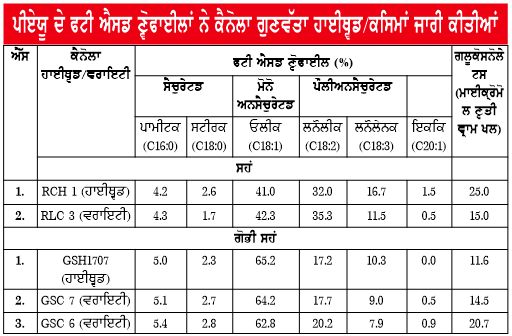 ਸੋ, ਕੈਨੋਲਾ ਤੇਲ ਦੀ ਵਧਦੀ ਮੰਗ ਨੂੰ ਪੂਰਾ ਕਰਨ ਲਈ ਪੰਜਾਬ ਖੇਤੀਬਾੜੀ ਯੂਨੀਵਰਸਿਟੀ ਵੱਲੋਂ ਕੈਨੋਲਾ ਦੀਆਂ ਗੁਣਵੱਤਾ ਵਾਲੀਆਂ ਕਿਸਮਾਂ ਵਿਕਸਿਤ ਕੀਤੀਆਂ ਗਈਆਂ ਹਨ। ਇਨ੍ਹਾਂ ਵਿੱਚ ਰਾਇਆ ਦੀ RLC 3 ਅਤੇ RCH 1 (ਹਾਈਬ੍ਰਿਡ) ਅਤੇ GSC 6 ਅਤੇ GSC 7 (ਕਿਸਮਾਂ), GSH 1707 (ਹਾਈਬ੍ਰਿਡ) ਗੋਭੀ ਸਰ੍ਹੋਂ ਸ਼ਾਮਲ ਹਨ। ਉਪਰੋਕਤ ਕਿਸਮਾਂ ਅਤੇ ਹਾਈਬ੍ਰਿਡਾਂ ਤੋਂ ਪੈਦਾ ਹੋਏ ਤੇਲ ਦੀ ਗੁਣਵੱਤਾ ਕੈਨੇਡਾ ਵਰਗੇ ਉੱਨਤ ਦੇਸ਼ਾਂ ਤੋਂ ਆਯਾਤ ਕੀਤੇ ਗਏ ਕੈਨੋਲਾ ਤੇਲ ਵਰਗੀ ਹੀ ਹੁੰਦੀ ਹੈ। ਇਸ ਲਈ ਕਿਸਾਨਾਂ ਨੂੰ ਆਪਣੀ ਫਸਲ ਦੇ ਚੰਗੇ ਉਤਪਾਦਨ ਅਤੇ ਵਧੇਰੇ ਮੁਨਾਫ਼ੇ ਲਈ, ਖ਼ਪਤਕਾਰਾਂ ਲਈ ਉੱਚ ਗੁਣਵੱਤਾ ਤੇਲ ਦੀ ਉਪਲੱਬਧਤਾ ਲਈ ਅਤੇ ਪਸ਼ੂਆਂ ਲਈ ਉੱਚ ਗੁਣਵੱਤਾ ਵਾਲੀ ਖਲ ਬਣਾਉਣ ਲਈ ਕੈਨੋਲਾ ਕਿਸਮਾਂ ਦੀ ਹੀ ਕਾਸ਼ਤ ਕਰਨੀ ਚਾਹੀਦੀ ਹੈ।
