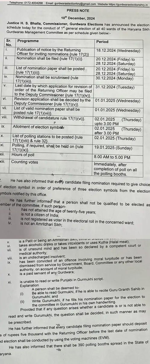 ਹਰਿਆਣਾ ਸਿੱਖ ਗੁਰਦੁਆਰਾ ਪ੍ਰਬੰਧਕ ਕਮੇਟੀ (ਐਚਐਸਜੀਐਮਸੀ) ਦੀਆਂ ਚੋਣਾਂ ਦੀ ਮਿਤੀ ਦਾ ਐਲਾਨ ਕਰ ਦਿੱਤਾ ਗਿਆ ਹੈ। ਇਸ ਸਬੰਧੀ ਕਮਿਸ਼ਨਰ ਗੁਰਦੁਆਰਾ ਪ੍ਰਬੰਧਕ ਕਮੇਟੀ ਵੱਲੋਂ ਚੋਣ ਸ਼ਡਿਊਲ ਜਾਰੀ ਕਰ ਦਿੱਤਾ ਗਿਆ ਹੈ। ਸ਼ਡਿਊਲ ਮੁਤਾਬਿਕ 18 ਦਸੰਬਰ ਨੂੰ ਚੋਣ ਨੋਟੀਫਿਕੇਸ਼ਨ ਜਾਰੀ ਕੀਤਾ ਜਾਵੇਗਾ ਅਤੇ 19 ਜਨਵਰੀ ਨੂੰ 40 ਵਾਰਡਾਂ ਲਈ ਵੋਟਿੰਗ ਹੋਵੇਗੀ। ਵੋਟਿੰਗ ਸਵੇਰੇ 8 ਵਜੇ ਤੋਂ ਸ਼ਾਮ 5 ਵਜੇ ਤੱਕ ਜਾਰੀ ਰਹੇਗੀ। ਵੋਟਿੰਗ ਤੋਂ ਤੁਰੰਤ ਬਾਅਦ ਗਿਣਤੀ ਕਰਕੇ ਨਤੀਜਿਆਂ ਦਾ ਐਲਾਨ ਕਰ ਦਿੱਤਾ ਜਾਵੇਗਾ।