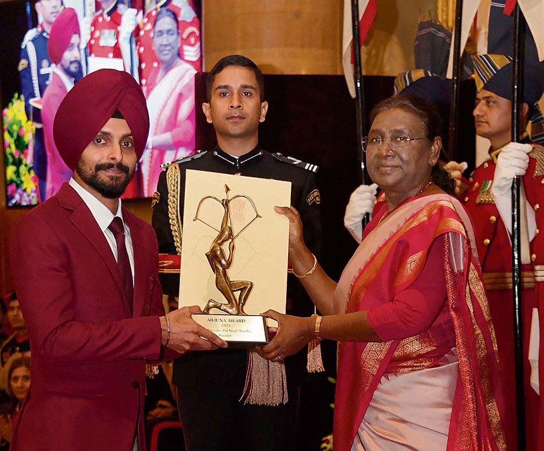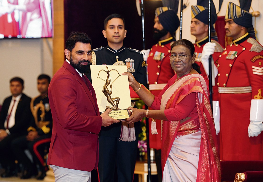 ਭਾਰਤ ਲਈ ਸਰਬੋਤਮ ਪ੍ਰਦਰਸ਼ਨ ਕਰਨ ਵਾਲੇ ਖਿਡਾਰੀਆਂ ਨੂੰ ਅੱਜ ਇੱਥੇ ਰਾਸ਼ਟਰਪਤੀ ਭਵਨ ਵਿੱਚ ਇੱਕ ਸਮਾਗਮ ਦੌਰਾਨ ਰਾਸ਼ਟਰਪਤੀ ਦਰੋਪਦੀ ਮੁਰਮੂ ਨੇ ਕੌਮੀ ਖੇਡ ਪੁਰਸਕਾਰਾਂ ਨਾਲ ਸਨਮਾਨਿਤ ਕੀਤਾ। ਇਸ ਦੌਰਾਨ ਕ੍ਰਿਕਟਰ ਮੁਹੰਮਦ ਸ਼ਮੀ ਅਤੇ ਪੈਰਾ ਤੀਰਅੰਦਾਜ਼ ਸ਼ੀਤਲ ਦੇਵੀ ਸਣੇ 26 ਖਿਡਾਰੀਆਂ ਨੂੰ ਅਰਜੁਨ ਐਵਾਰਡ ਦਿੱਤੇ ਗਏ। ਬੈਡਮਿੰਟਨ ਖਿਡਾਰੀ ਚਿਰਾਗ ਸ਼ੈੱਟੀ ਅਤੇ ਸਾਤਵਿਕਸਾਈਰਾਜ ਰੰਕੀਰੈੱਡੀ ਦੀ ਜੋੜੀ ਨੂੰ ਵੱਕਾਰੀ ਮੇਜਰ ਧਿਆਨ ਚੰਦ ਖੇਲ ਰਤਨ ਪੁਰਸਕਾਰ ਲਈ ਚੁਣਿਆ ਗਿਆ। ਇਸ ਜੋੜੀ ਨੇ 2023 ਵਿੱਚ ਏਸ਼ਿਆਈ ਖੇਡਾਂ ਵਿੱਚ ਆਪਣਾ ਅਤੇ ਬੈਡਮਿੰਟਨ ਵਿੱਚ ਦੇਸ਼ ਲਈ ਪਹਿਲਾ ਸੋਨ ਤਗਮਾ ਜਿੱਤਿਆ ਸੀ। ਜੋੜੀ ਇਸ ਵੇਲੇ ਮਲੇਸ਼ੀਆ ਓਪਨ ਸੁਪਰ 1000 ਵਿੱਚ ਖੇਡ ਰਹੀ ਹੈ, ਜਿਸ ਕਰਕੇ ਸਮਾਗਮ ਵਿੱਚ ਸ਼ਾਮਲ ਨਹੀਂ ਹੋਈ। ਸਟਾਰ ਪਿਸਟਲ ਨਿਸ਼ਾਨੇਬਾਜ਼ 19 ਸਾਲਾ ਈਸ਼ਾ ਸਿੰਘ ਵੀ ਜਕਾਰਤਾ ’ਚ ਏਸ਼ਿਆਈ ਓਲੰਪਿਕ ਕੁਆਲੀਫਾਇਰ ’ਚ ਹਿੱਸਾ ਲੈਣ ਕਰਕੇ ਸਮਾਗਮ ’ਚ ਸ਼ਾਮਲ ਨਹੀਂ ਹੋ ਸਕੀ। ਉਸ ਨੇ ਬੀਤੇ ਦਿਨ 10 ਮੀਟਰ ਏਅਰ ਪਿਸਟਲ ਮੁਕਾਬਲੇ ਵਿੱਚ ਵਿਅਕਤੀਗਤ ਅਤੇ ਟੀਮ ਮੁਕਾਬਲੇ ’ਚ ਸੋਨ ਤਗਮਾ ਜਿੱਤ ਕੇ ਪੈਰਿਸ ਓਲੰਪਿਕ ਲਈ ਕੁਆਲੀਫਾਈ ਕੀਤਾ ਹੈ।