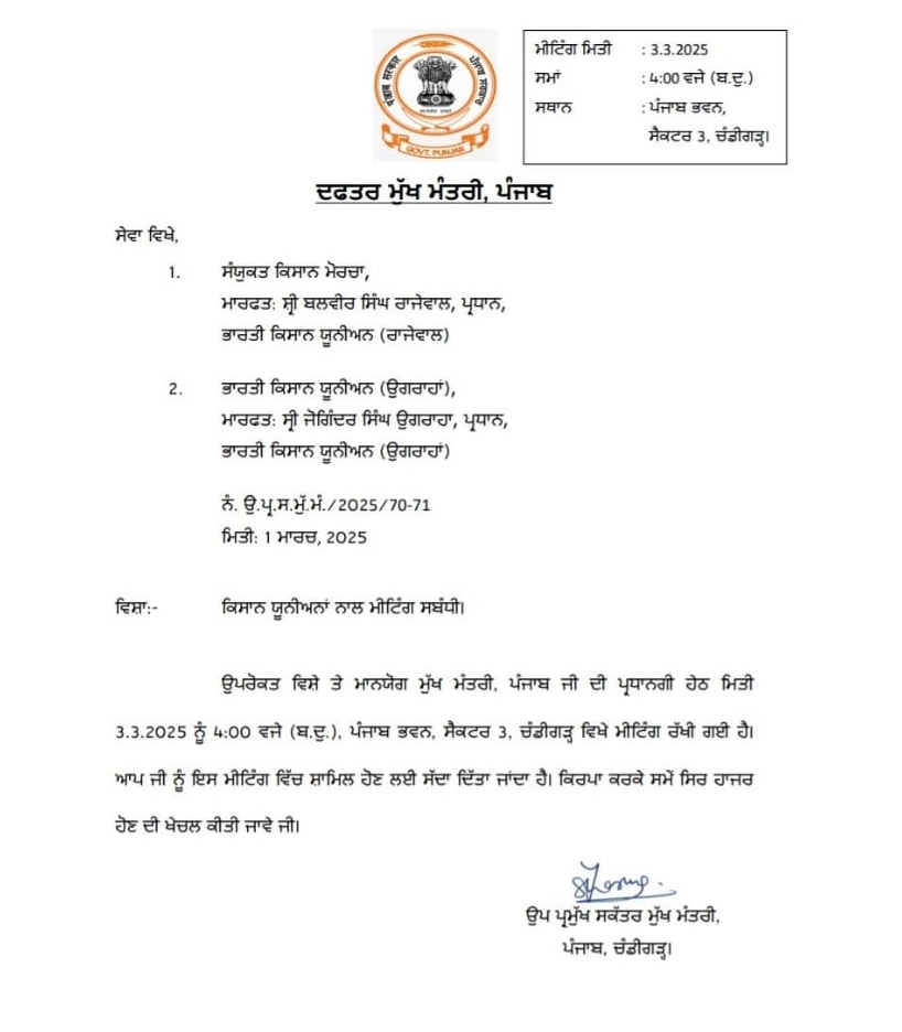 ਇਹ ਮੀਟਿੰਗ 3 ਮਾਰਚ ਨੂੰ ਸ਼ਾਮ 4 ਵਜੇ ਚੰਡੀਗੜ੍ਹ ਵਿਖੇ ਸਥਿਤ ਪੰਜਾਬ ਭਵਨ ਵਿੱਚ ਹੋਵੇਗੀ। ਇਸ ਸਬੰਧੀ ਮੁੱਖ ਮੰਤਰੀ ਦਫ਼ਤਰ ਵੱਲੋਂ ਸੰਯੁਕਤ ਕਿਸਾਨ ਮੋਰਚਾ ਤੇ ਭਾਰਤੀ ਕਿਸਾਨ ਯੂਨੀਅਨ (ਉਗਰਾਹਾਂ) ਦੇ ਨਾਮ ਪੱਤਰ ਲਿਖ ਦਿੱਤਾ ਹੈ।