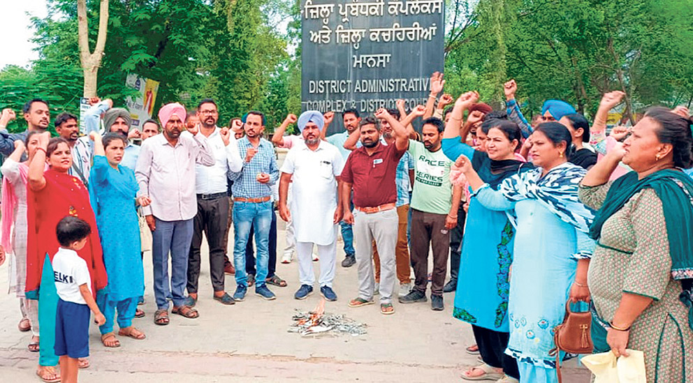 ਮਾਨਸਾ (ਪੱਤਰ ਪ੍ਰੇਰਕ): ਕੱਚੇ ਅਧਿਆਪਕਾਂ ਨੇ ਪੰਜਾਬ ਸਰਕਾਰ ਦੇ ਪੱਕੇ ਕਰਨ ਦੇ ਤਾਜ਼ਾ ਨਿਯੁਕਤੀ ਪੱਤਰਾਂ ਨੂੰ ਝੂਠਾ ਕਰਾਰ ਦਿੰਦਿਆਂ ਮਾਨਸਾ ਜ਼ਿਲ੍ਹਾ ਕਚਹਿਰੀਆਂ ਸਾਹਮਣੇ ਪੱਕੇ ਆਰਡਰਾਂ ਦੀਆਂ ਕਾਪੀਆਂ ਨੂੰ ਸਾੜਿਆ। ਉਨ੍ਹਾਂ ਦੁੱਖ ਜ਼ਾਹਿਰ ਕੀਤਾ ਹੈ ਕਿ ਮੌਜੂਦਾ ਪੰਜਾਬ ਸਰਕਾਰ ਵੀ ਹੁਣ ਕੱਚੇ ਅਧਿਆਪਕਾਂ ਨਾਲ ਕੋਝੇ ਮਜ਼ਾਕ ਕਰਨ ਲੱਗੀ ਹੈ। ਕੱਚੇ ਅਧਿਆਪਕਾਂ ਨੇ ਦੋਸ਼ ਲਾਇਆ ਕਿ ਪੰਜਾਬ ਭਰ ’ਚ ਅੱਜ ਕੱਚੇ ਅਧਿਆਪਕਾਂ ਨੂੰ ਪੱਕਾ ਕਰਨ ਦਾ ਸਿਰਫ਼ ਡਰਾਮਾ ਕੀਤਾ ਗਿਆ ਹੈ, ਜਦੋਂ ਕਿ ਨਿਯੁਕਤੀ ਪੱਤਰਾਂ ’ਚ ਕਿਧਰੇ ਵੀ ਰੈਗੂਲਰ ਸ਼ਬਦ ਨਹੀਂ ਲੱਭਦਾ। ਕੱਚੇ ਅਧਿਆਪਕਾਂ ਦੀ ਹਮਾਇਤ ’ਤੇ ਆਈਆਂ ਰੈਗੂਲਰ ਅਧਿਆਪਕ ਜਥੇਬੰਦੀਆਂ ਦੇ ਆਗੂਆਂ ਨੇ ਪੰਜਾਬ ਸਰਕਾਰ ਵਿਰੁੱਧ ਨਾਅਰੇਬਾਜ਼ੀ ਕਰਦਿਆਂ ਐਲਾਨ ਕੀਤਾ ਕਿ ਅਗਲੇ ਦਿਨਾਂ ਦੌਰਾਨ ਪੰਜਾਬ ਭਰ ਵਿੱਚ ਮੁੱਖ ਮੰਤਰੀ ਭਗਵੰਤ ਮਾਨ ਦੀਆਂ ਅਰਥੀਆਂ ਸਾੜਦਿਆਂ ‘ਆਪ’ ਦੀ ਹਕੂਮਤ ਵਿਰੁੱਧ ਤਿੱਖਾ ਸੰਘਰਸ਼ ਵਿੱਢਿਆ ਜਾਵੇਗਾ।ਡੀਟੀਐੱਫ ਦੇ ਜ਼ਿਲ੍ਹਾ ਪ੍ਰਧਾਨ ਕਰਮਜੀਤ ਤਾਮਕੋਟ ਨੇ ਕਿਹਾ ਕਿ ਪੰਜਾਬ ਸਰਕਾਰ ਵੱਲੋਂ ਅੱਜ 12500 ਕੱਚੇ ਅਧਿਆਪਕਾਂ ਨੂੰ ਰੈਗੂਲਰ ਆਰਡਰ ਦੇਣ ਦਾ ਡਰਾਮਾ ਕੀਤਾ ਗਿਆ ਸੀ।ਉਨ੍ਹਾਂ ਕਿਹਾ ਸਿਰਫ ਕੱਚੇ ਅਧਿਆਪਕਾਂ ਦੀਆਂ ਤਨਖਾਹਾਂ ਵਿੱਚ ਮਾਮੂਲੀ ਵਾਧਾ ਕਰਕੇ ਸਰਕਾਰ ਉਨ੍ਹਾਂ ਨੂੰ ਗੁੰਮਰਾਹ ਕਰ ਰਹੀ ਹੈ। ਅਧਿਆਪਕ ਆਗੂ ਅਮੋਲਕ ਸਿੰਘ ਡੇਲੂਆਣਾ ਨੇ ਕਿਹਾ ਕਿ ਸਰਕਾਰ ਦੀ ਇਸ ਚਾਲ ਨੂੰ ਕਿਸੇ ਵੀ ਕੀਮਤ ’ਤੇ ਬਰਦਾਸ਼ਤ ਨਹੀਂ ਕੀਤਾ ਜਾਵੇਗਾ।