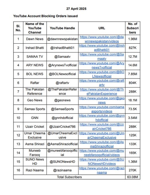 ਕੇਂਦਰ ਸਰਕਾਰ ਨੇ ਦੇਸ਼ ਦੀ ਸੁਰੱਖਿਆ ਅਤੇ ਅਖੰਡਤਾ ਦੇ ਮੱਦੇਨਜ਼ਰ ਇੱਕ ਵੱਡਾ ਕਦਮ ਚੁੱਕਦਿਆਂ ਭਾਰਤ ਵਿੱਚ 16 ਪਾਕਿਸਤਾਨੀ ਯੂਟਿਊਬ ਚੈਨਲਾਂ ਨੂੰ ਬਲੌਕ ਕਰ ਦਿੱਤਾ ਹੈ। ਇਹ ਕਾਰਵਾਈ ਪਹਿਲਗਾਮ ਹਮਲੇ ਮਗਰੋਂ ਗ੍ਰਹਿ ਮੰਤਰਾਲੇ ਦੀਆਂ ਸਿਫਾਰਸ਼ਾਂ ’ਤੇ ਕੀਤੀ ਗਈ ਹੈ।