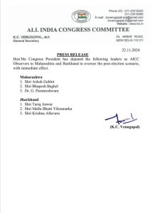 ਕਾਂਗਰਸ ਨੇ ਹਾਲ ਹੀ ਵਿਚ ਮਹਾਰਾਸ਼ਟਰ ਤੇ ਝਾਰਖੰਡ ਵਿਚ ਮੁਕੰਮਲ ਹੋਈਆਂ ਵਿਧਾਨ ਸਭਾ ਚੋਣਾਂ ਤੋਂ ਬਾਅਦ ਦੇ ਅਮਲ ਦੀ ਨਿਗਰਾਨੀ ਕਰਨ ਲਈ ਦੋ ਸੂਬਿਆਂ ਵਿਚ ਚੋਣ ਆਬਜ਼ਰਵਰ ਲਾ ਦਿੱਤੇ ਹਨ। ਕਾਂਗਰਸ ਨੇ ਮਹਾਰਾਸ਼ਟਰ ਲਈ ਅਸ਼ੋਕ ਗਹਿਲੋਤ, ਭੁਪੇਸ਼ ਬਘੇਲ, ਜੀ ਪਰਮੇਸ਼ਵਰ ਜਦਕਿ ਝਾਰਖੰਡ ਲਈ ਤਾਰਿਕ ਅਨਵਰ, ਮੱਲੂ ਵਿਕਰਾਮਾਰਕਾ, ਕ੍ਰਿਸ਼ਨਾ ਅੱਲਾਵੁਰੂ ਨੂੰ ਨਿਯੁਕਤ ਕੀਤਾ ਹੈ। ਪੀਟੀਆਈ