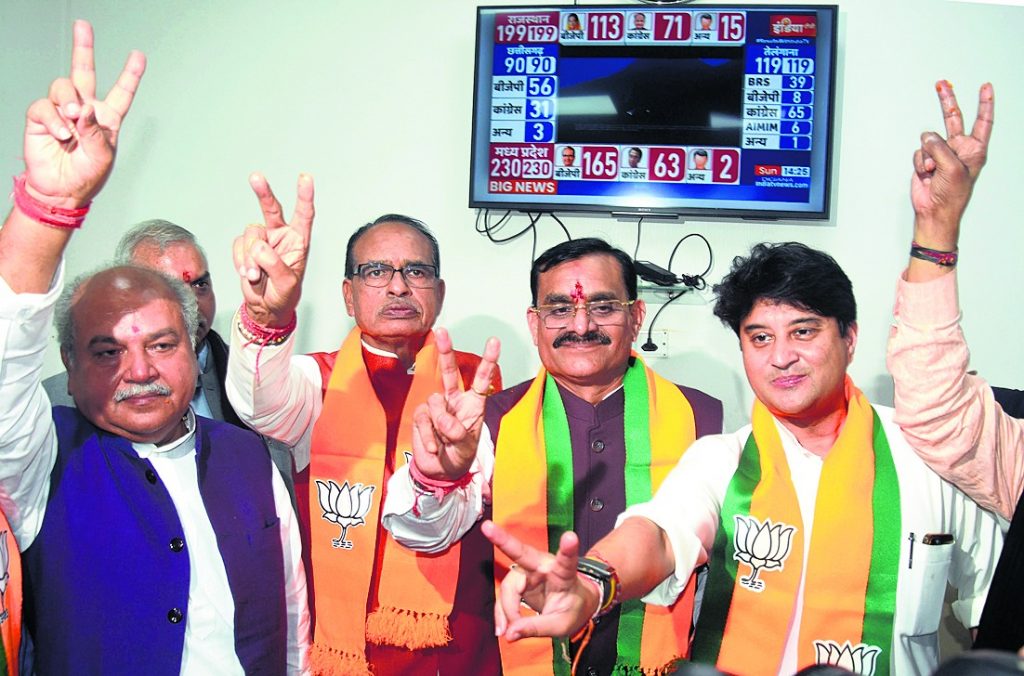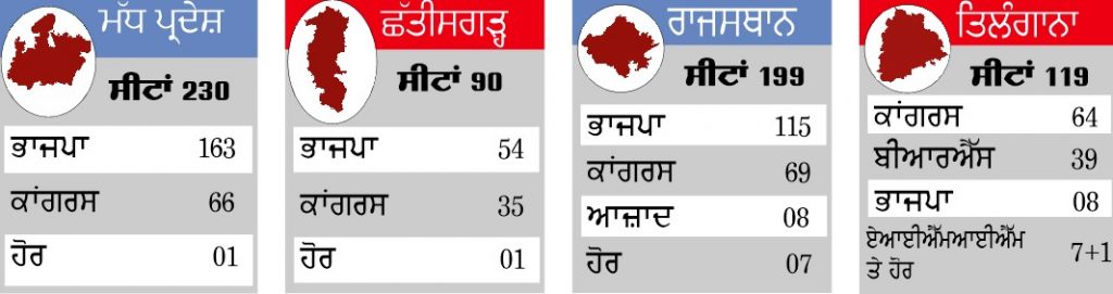 ਮੱਧ ਪ੍ਰਦੇਸ਼, ਰਾਜਸਥਾਨ ਅਤੇ ਛੱਤੀਸਗੜ੍ਹ ਵਿੱਚ ਖਿੜਿਆ ਕਮਲ; ਤਿਲੰਗਾਨਾ ਵਿੱਚ ਕਾਂਗਰਸ ਜਿੱਤੀ