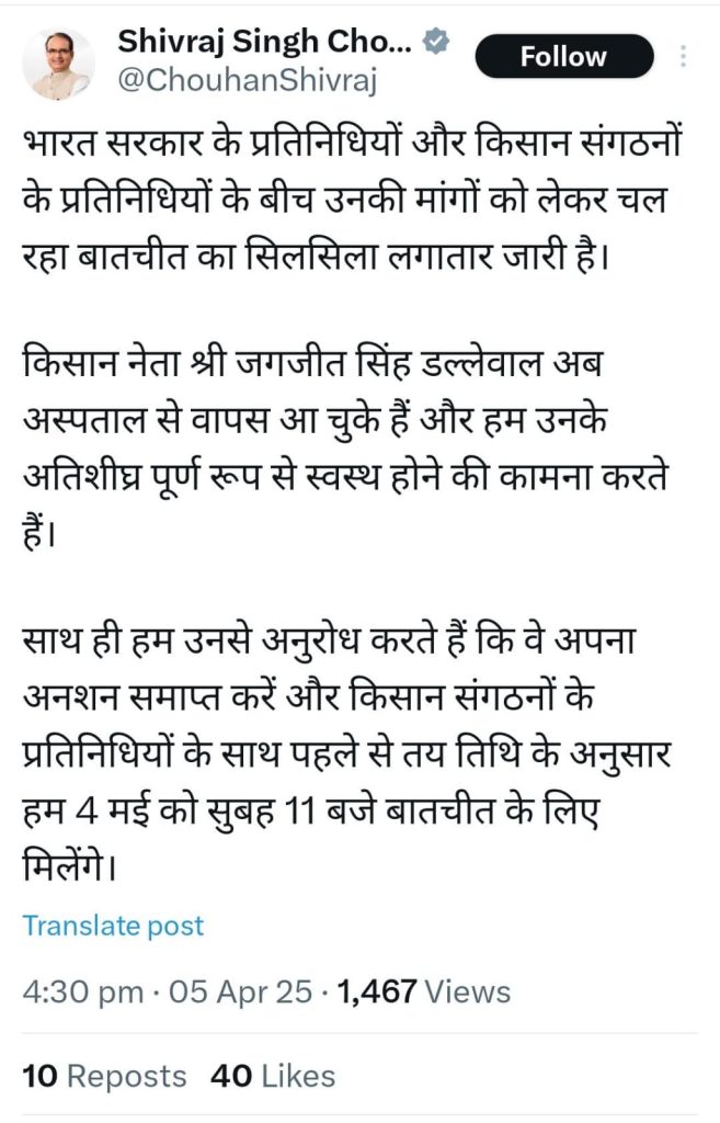 ਕੇਂਦਰੀ ਖੇਤੀਬਾੜੀ ਮੰਤਰੀ ਸ਼ਿਵਰਾਜ ਸਿੰਘ ਚੌਹਾਨ ਨੇ ਕਿਹਾ ਕਿ ਸੰਯੁਕਤ ਕਿਸਾਨ ਮੋਰਚਾ (ਗ਼ੈਰ-ਸਿਆਸੀ) ਅਤੇ ਕਿਸਾਨ ਮਜ਼ਦੂਰ ਮੋਰਚਾ ਵੱਲੋਂ ਕਿਸਾਨਾਂ ਦੀਆਂ ਸਾਰੀਆਂ ਫ਼ਸਲਾਂ ਦੀ MSP ’ਤੇ ਖਰੀਦ ਦੀ ਕਾਨੂੰਨੀ ਗਾਰੰਟੀ ਤੇ ਹੋਰਨਾਂ ਮੰਗਾਂ ਨੂੰ ਲੈ ਕੇ ਕੇਂਦਰ ਸਰਕਾਰ ਤੇ ਕਿਸਾਨਾਂ ਵਿਚਕਾਰ ਚੱਲ ਰਹੀ ਗੱਲਬਾਤ ਜਾਰੀ ਰਹੇਗੀ। ਉਨ੍ਹਾਂ ਨੇ ਇਹ ਪ੍ਰਗਟਾਵਾ ਸੋਸ਼ਲ ਮੀਡੀਆ ’ਤੇ ਕੀਤਾ। ਕੇਂਦਰੀ ਮੰਤਰੀ ਨੇ ਕਿਸਾਨਾਂ ਨੂੰ 4 ਮਈ ਨੂੰ ਮੁਲਾਕਾਤ ਦਾ ਸੱਦਾ ਦਿੱਤਾ ਹੈ।