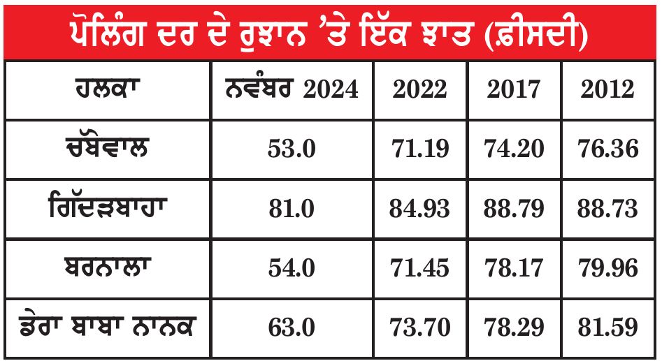 ਪੋਲਿੰਗ ਦਰ ’ਚ ਹਲਕਾ ਗਿੱਦੜਬਾਹਾ ਨੇ ਝੰਡੀ ਲੈ ਕੇ ਆਪਣੀ ਪੁਰਾਣੀ ਰਵਾਇਤ ਕਾਇਮ ਰੱਖੀ ਹੈ ਜਦਕਿ ਬਾਕੀ ਤਿੰਨ ਹਲਕਿਆਂ ਵਿਚ ਪਿਛਲੀਆਂ ਅਸੈਂਬਲੀ ਚੋਣਾਂ ਮੁਕਾਬਲੇ ਪੋਲਿੰਗ ਘਟੀ ਹੈ। ਗਿੱਦੜਬਾਹਾ ’ਚ ਪੋਲਿੰਗ 81 ਫ਼ੀਸਦ ਰਹੀ ਜਦਕਿ ਸਾਲ 2022 ਵਿਚ ਇਹ 84.93 ਫ਼ੀਸਦੀ, 2017 ਵਿਚ 88.79 ਫ਼ੀਸਦੀ ਸੀ। ਬਰਨਾਲਾ ਦੀ ਪੋਲਿੰਗ ਦਰ ਸਾਲ 2022 ਵਿੱਚ 71.45 ਫ਼ੀਸਦੀ ਤੇ ਸਾਲ 2017 ਵਿੱਚ 78.17 ਫ਼ੀਸਦੀ ਸੀ ਅਤੇ ਅੱਜ ਇਹ ਦਰ 54 ਫ਼ੀਸਦੀ ਰਹਿ ਗਈ ਹੈ। ਡੇਰਾ ਬਾਬਾ ਨਾਨਕ ਦੀ 63 ਫ਼ੀਸਦੀ ਪੋਲਿੰਗ ਦਰ ਰਹੀ ਜੋ ਕਿ ਸਾਲ 2022 ਵਿਚ 73.70 ਫ਼ੀਸਦੀ ਸੀ। ਚੱਬੇਵਾਲ ਦੀ ਸਾਲ 2022 ਵਿਚ ਪੋਲਿੰਗ ਦਰ 71.19 ਫ਼ੀਸਦੀ ਤੇ ਸਾਲ 2017 ਵਿਚ 74.20 ਫ਼ੀਸਦੀ ਰਹੀ ਹੈ ਅਤੇ ਅੱਜ ਇਹ ਦਰ 53 ਫ਼ੀਸਦੀ ਰਹਿ ਗਈ ਹੈ।