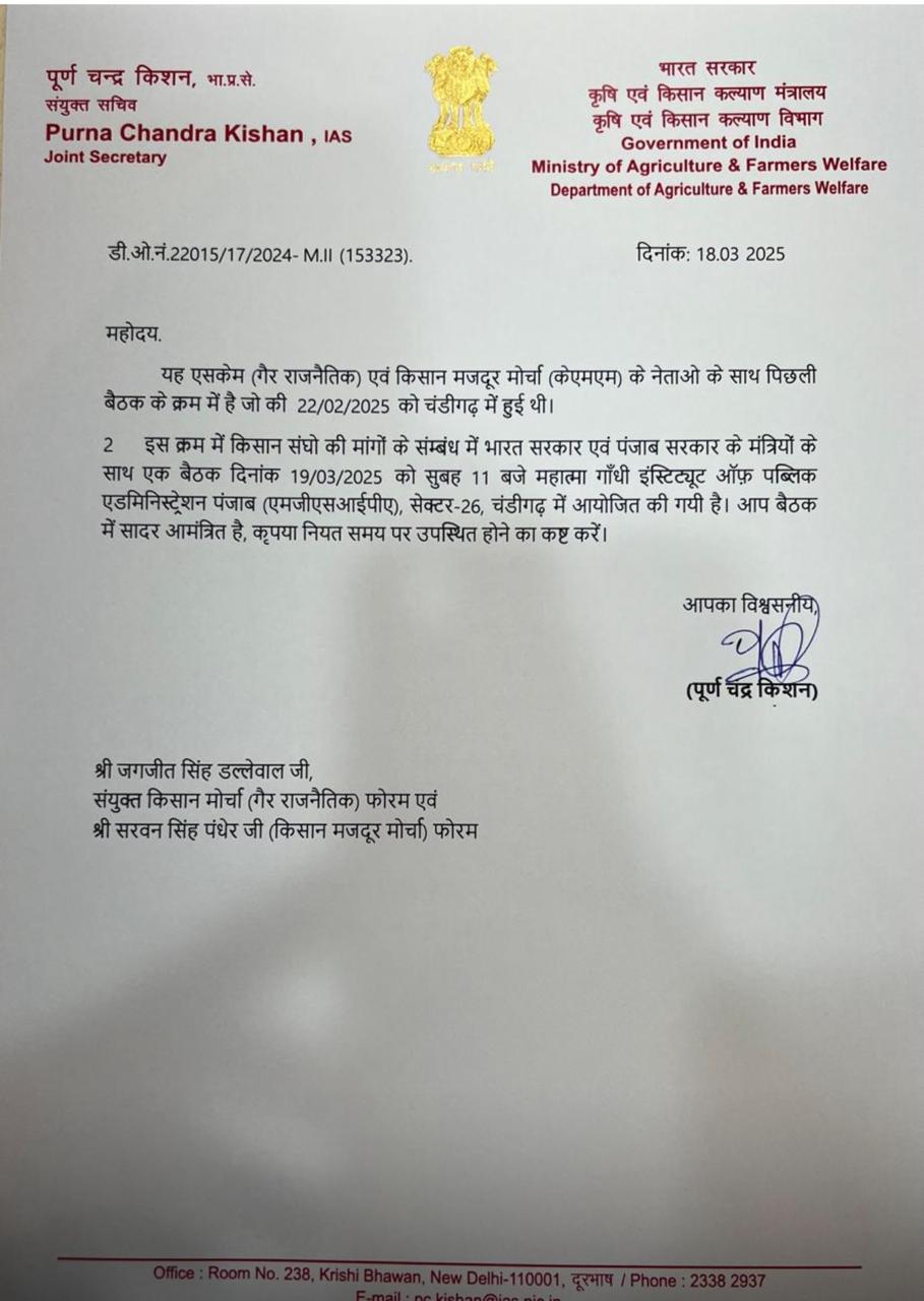 ਕੇਂਦਰ ਸਰਕਾਰ ਵੱਲੋਂ ਇਹ ਪੱਤਰ ਸੰਯੁਕਤ ਕਿਸਾਨ ਮੋਰਚਾ ਗੈਰ-ਸਿਆਸੀ ਦੇ ਆਗੂ ਜਗਜੀਤ ਸਿੰਘ ਡੱਲੇਵਾਲ ਅਤੇ ਕਿਸਾਨ ਮਜ਼ਦੂਰ ਮੋਰਚਾ ਦੇ ਆਗੂ ਸਰਵਣ ਸਿੰਘ ਪੰਧੇਰ ਦੇ ਨਾਮ ਜਾਰੀ ਕੀਤਾ ਗਿਆ ਹੈ। ਯਾਦ ਰਹੇ ਕਿ ਇਸ ਸਬੰਧੀ ਪਹਿਲੀ ਮੀਟਿੰਗ 14 ਫਰਵਰੀ ਨੂੰ ਅਤੇ ਦੂਜੀ 22 ਫਰਵਰੀ ਨੂੰ ਹੋਈ ਸੀ ਜਦ ਕਿ ਹੁਣ ਤੀਜੀ ਮੀਟਿੰਗ 19 ਫਰਵਰੀ ਨੂੰ ਹੋਣ ਜਾ ਰਹੀ ਹੈ।