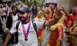 ਖਿਡਾਰੀਆਂ ਨੂੰ ਹਵਾਈ ਅੱਡੇ ਤੋਂ ਸਿੱਧਾ ਆਈਟੀਸੀ ਮੌਰਿਆ ਸ਼ੈਰੇਟਨ ਹੋਟਲ ਲਿਜਾਇਆ ਗਿਆ। ਹੋਟਲ ਵਿਚ ਢੋਲ ਤੇ ਰਵਾਇਤੀ ਭੰਗੜੇ ਨਾਲ ਟੀਮ ਇੰਡੀਆ ਨੂੰ ਜੀ ਆਇਆਂ ਆਖਿਆ ਗਿਆ। ਕਪਤਾਨ ਰੋਹਿਤ ਸ਼ਰਮਾ, ਹਰਫਨਮੌਲਾ ਹਾਰਦਿਕ ਪਾਂਡਿਆ, ਸੂਰਿਆਕੁਮਾਰ ਯਾਦਵ ਤੇ ਰਿਸ਼ਭ ਪੰਤ ਸਣੇ ਜ਼ਿਆਦਾਤਰ ਖਿਡਾਰੀਆਂ ਨੇ ਢੋਲ ਦੇ ਡਗੇ ’ਤੇ ਹੋਰਨਾਂ ਨਾਲ ਭੰਗੜਾ ਪਾਇਆ। ਮਗਰੋਂ ਹੋਟਲ ਵਿਚ ਜਿੱਤ ਦੀ ਖ਼ੁਸ਼ੀ ’ਚ ਕੇਕ ਵੀ ਕੱਟਿਆ ਗਿਆ। -ਪੀਟੀਆਈ