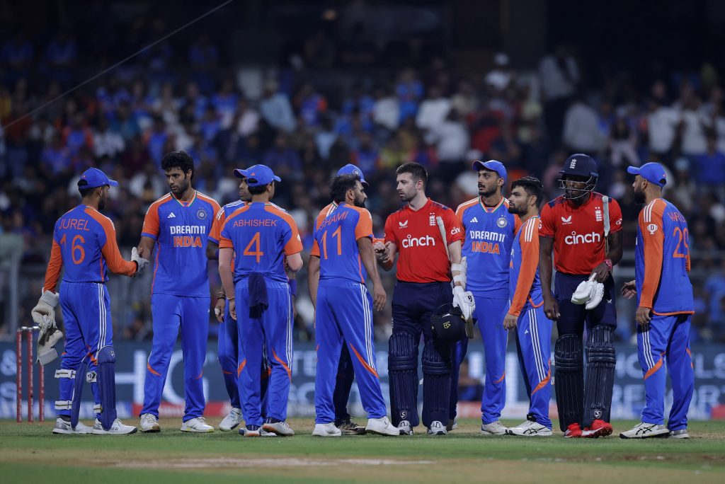 ਭਾਰਤ ਵੱਲੋਂ ਦਿੱਤੇ 248 ਦੌੜਾਂ ਦੇ ਟੀਚੇ ਦਾ ਪਿੱਛਾ ਕਰਦਿਆਂ ਇੰਗਲੈਂਡ ਟੀਮ 10.3 ਓਵਰਾਂ ’ਚ 97 ਦੌੜਾਂ ’ਤੇ ਹੀ ਆਊਟ ਹੋ ਗਈ। ਮਹਿਮਾਨ ਟੀਮ ਵੱਲੋਂ ਸਲਾਮੀ ਬੱਲੇਬਾਜ਼ ਫਿਲਿਪ ਸਾਲਟ ਨੇ ਸਭ ਤੋਂ ਵੱਧ 55 ਦੌੜਾਂ ਤੇ ਜੈਕਬ ਬੈੱਥਲ ਨੇ 10 ਦੌੜਾਂ ਬਣਾਈਆਂ ਜਦਕਿ ਬਾਕੀ ਕੋਈ ਵੀ ਬੱਲੇਬਾਜ਼ ਦਹਾਈ ਦਾ ਅੰਕੜਾ ਨਾ ਛੂਹ ਸਕਿਆ। ਭਾਰਤੀ ਗੇਂਦਬਾਜ਼ਾਂ ਵਿੱਚੋਂ ਮੁਹੰਮਦ ਸ਼ੰਮੀ ਨੇ ਸਭ ਤੋਂ ਵੱਧ ਤਿੰਨ ਵਿਕਟਾਂ ਲਈਆਂ ਜਦਕਿ ਵਰੁਣ ਚਕਰਵਰਤੀ, ਸ਼ਿਵਮ ਦੂਬੇ ਤੇ ਅਭਿਸ਼ੇਕ ਸ਼ਰਮਾ ਨੇ ਦੋ ਦੋ ਵਿਕਟਾਂ ਹਾਸਲ ਕੀਤੀਆਂ। ਰਵੀ ਬਿਸ਼ਨੋਈ ਨੂੰ ਇੱਕ ਵਿਕਟ ਮਿਲੀ।