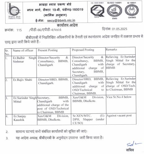 ਸੰਜੀਵ ਕੁਮਾਰ ਇਸ ਤੋਂ ਪਹਿਲਾਂ ਡਾਇਰੈਕਟਰ (ਡੈਮ ਸੇਫ਼ਟੀ) ਵਜੋਂ ਤਾਇਨਾਤ ਸੀ, ਉਨ੍ਹਾਂ ਦੀ ਥਾਂ ’ਤੇ ਹੁਣ ਪੰਜਾਬ ਦੇ ਆਕਾਸ਼ਦੀਪ ਸਿੰਘ ਨੂੰ ਲਗਾ ਦਿੱਤਾ ਹੈ। ਬੀਬੀਐੱਮਬੀ ਨੇ ਜਾਰੀ ਹੁਕਮਾਂ ਵਿੱਚ ਕਿਹਾ ਹੈ ਕਿ ਆਕਾਸ਼ਦੀਪ ਸਿੰਘ ਦੀ ਬੇਨਤੀ ’ਤੇ ਹੀ ਇਹ ਤਬਾਦਲਾ ਕੀਤਾ ਗਿਆ ਹੈ, ਜਦੋਂ ਕਿ ਆਕਾਸ਼ਦੀਪ ਸਿੰਘ ਨੇ ਲੰਘੀ ਰਾਤ ਕਰੀਬ ਪੌਣੇ ਬਾਰਾਂ ਵਜੇ ਬੀਬੀਐੱਮਬੀ ਨੂੰ ਈਮੇਲ ਜ਼ਰੀਏ ਕਿਹਾ ਹੈ ਕਿ ਉਸ ਨੇ ਤਾਂ ਅਜਿਹੀ ਕੋਈ ਬੇਨਤੀ ਕੀਤੀ ਹੀ ਨਹੀਂ ਹੈ।