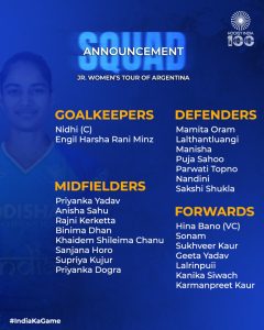 ਅਰਜਨਟੀਨਾ ਟੂਰਨਾਮੈਂਟ: ਹਾਕੀ ਇੰਡੀਆ ਵੱਲੋਂ ਭਾਰਤੀ ਜੂਨੀਅਰ ਮਹਿਲਾ ਟੀਮ ਦਾ ਐਲਾਨ