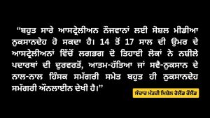 ਵੇਰਵਿਆਂ ਅਨੁਸਾਰ ਸਰਕਾਰੀ ਖੋਜ ਨੇ ਪਾਇਆ ਕਿ 95 ਪ੍ਰਤੀਸ਼ਤ ਆਸਟ੍ਰੇਲੀਅਨ ਦੇਖਭਾਲ ਕਰਨ ਵਾਲਿਆਂ ਨੂੰ ਆਨਲਾਈਨ ਸੁਰੱਖਿਆ ਉਹਨਾਂ ਦੀ ਸਭ ਤੋਂ ਔਖੀ ਪਾਲਣ-ਪੋਸ਼ਣ ਚੁਣੌਤੀਆਂ ਵਿੱਚੋਂ ਇੱਕ ਹੈ। ਉਨ੍ਹਾਂ ਕਿਹਾ ਕਿ ਸੋਸ਼ਲ ਮੀਡੀਆ ਦੀ ਇੱਕ ਸਮਾਜਿਕ ਜ਼ਿੰਮੇਵਾਰੀ ਸੀ ਅਤੇ ਉਹ ਆਪਣੇ ਪਲੇਟਫਾਰਮਾਂ ’ਤੇ ਨੁਕਸਾਨਾਂ ਨੂੰ ਹੱਲ ਕਰਨ ਵਿੱਚ ਬਿਹਤਰ ਕੰਮ ਕਰ ਸਕਦੇ ਹਨ।